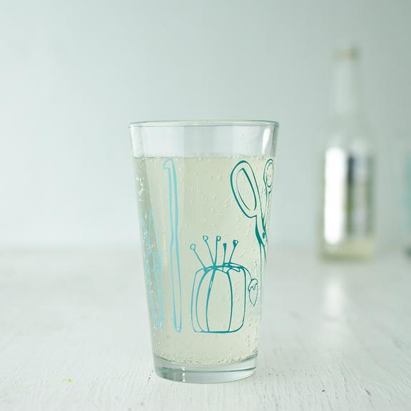 Get your creative and crafty juices (or beers) flowing. Scissors, snippers, pincushion, knitting needles, crochet hook, thread spool and cone are screen printed in turquoise all the way around this 16oz pint glass.