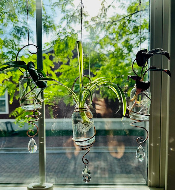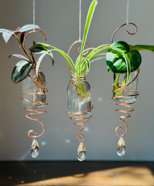 Get the most out of your plants and your window space with these hanging propagation pieces. Each unique propagation suncatcher is hand-made using a 3.75" mini mason jar, copper wire and crystal prisms.