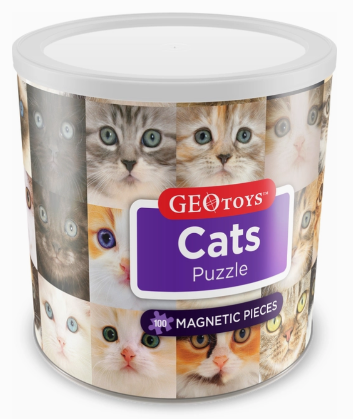 Cuddly cats 100-pc magnetic puzzle. This puzzle has a magnetic backing and is packaged in a small canister. Put it together on your table, refrigerator, or on a travel-friendly magnetic baking tray!