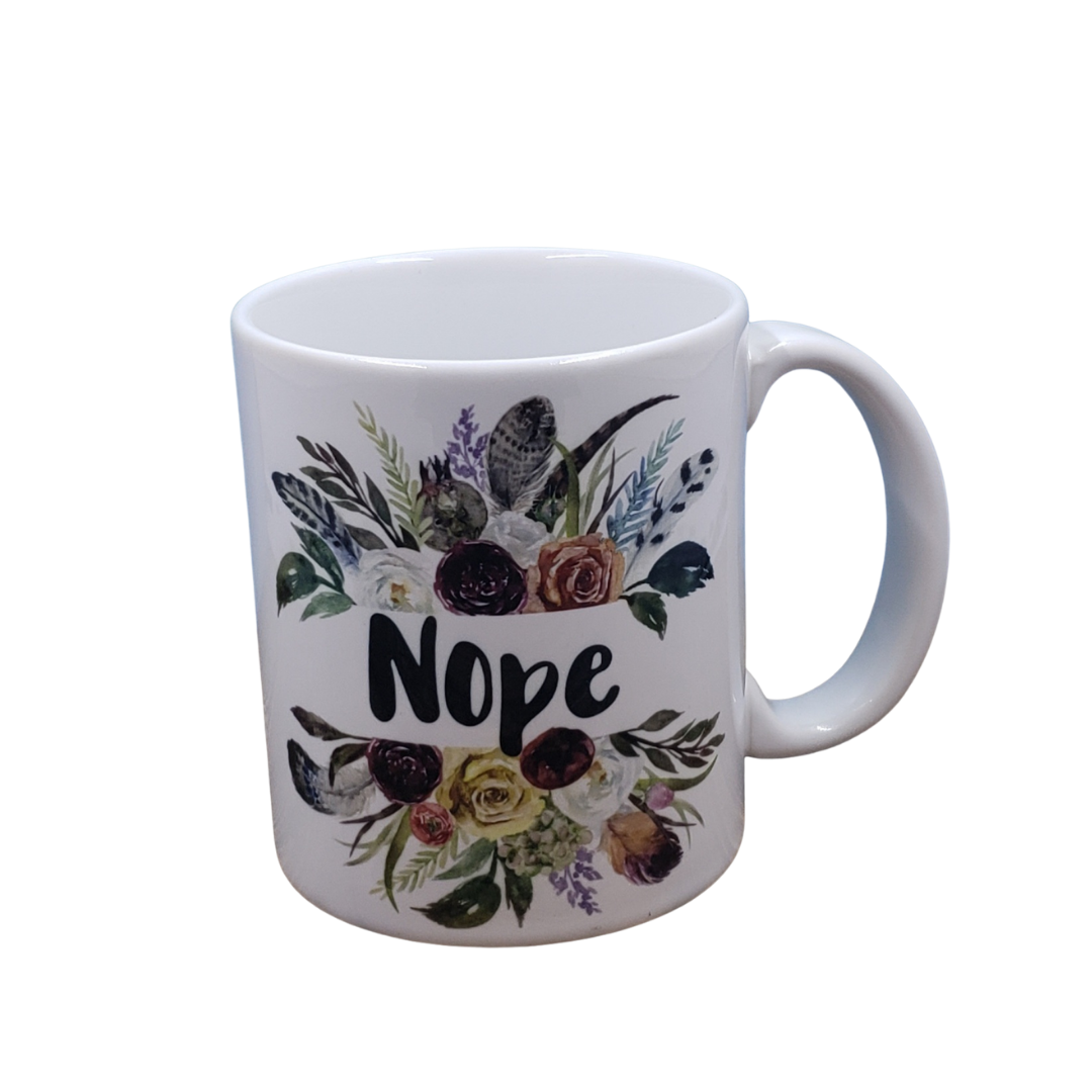 11oz white ceramic mug. Dishwasher and microwave safe.