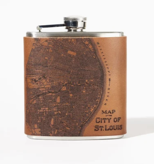 Stainless steel flask wrapped in vegetable tanned leather from Curwensville, Pennsylvania. Each dye cut flask wrap is hand carved or laser etched, treated with penetrating oil dye and water resistant sealer before stitching them with artificial sinew. The leather is then cemented to the flask for maximum durability.
