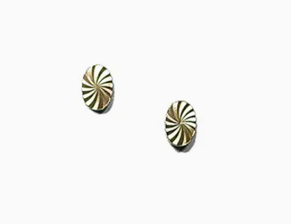 Tiny brass oval shaped stampings with soldered sterling silver posts and backs. Studs have been polished to a shine and sealed.