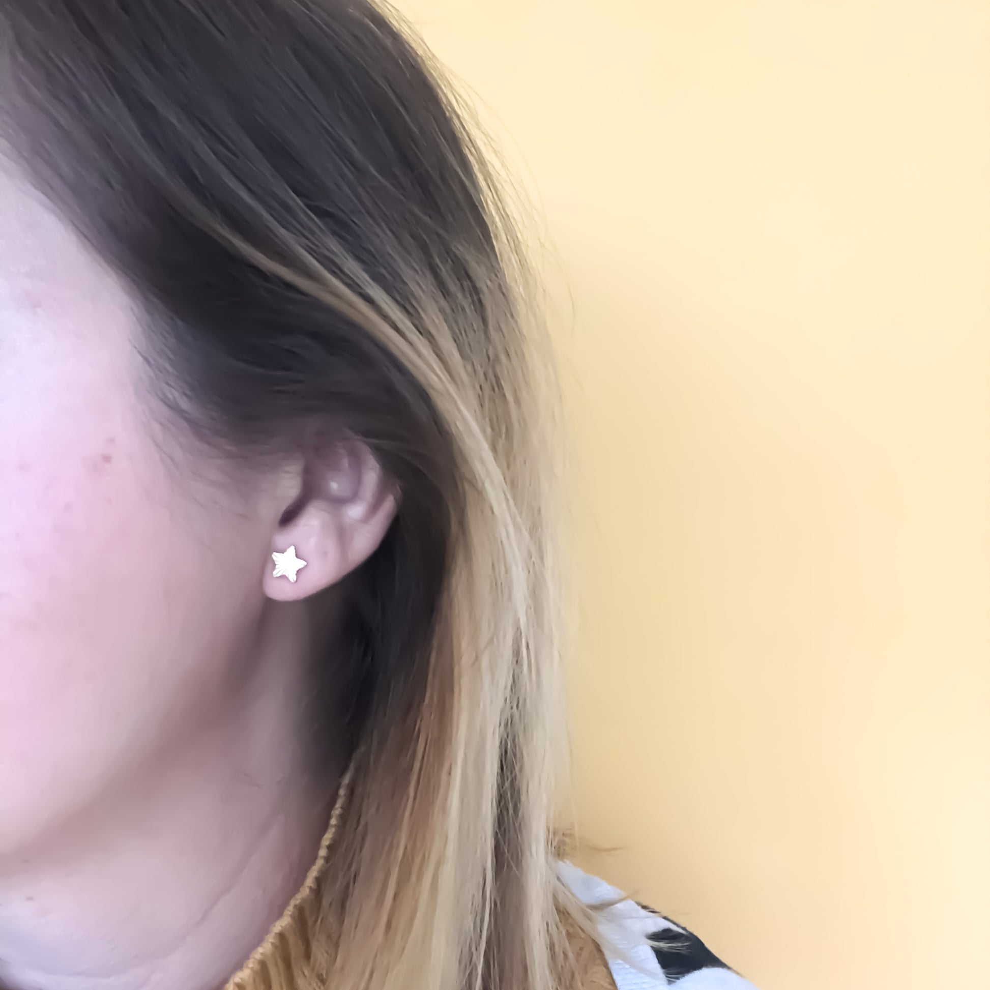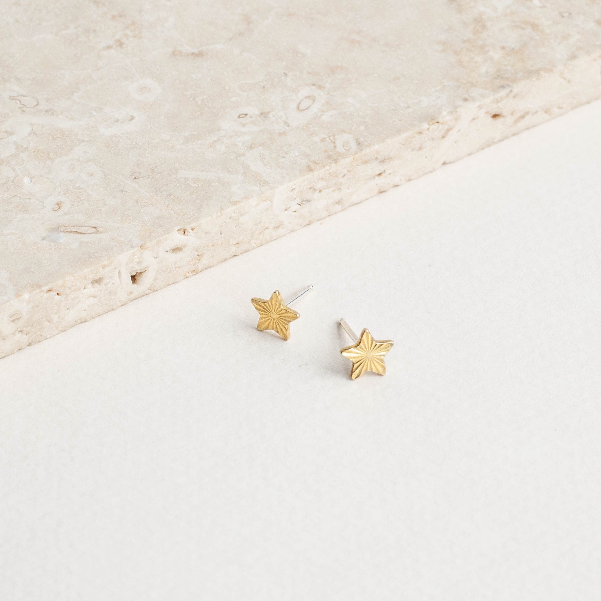 Tiny vintage brass starburst stars. Earrings are soldered to sterling silver posts, then polished and sealed with a clear varnish. 5 x 5mm.