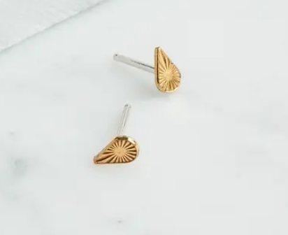 Tiny brass teardrop shaped stampings with soldered sterling silver posts and backs. Studs have been polished to a shine and sealed.