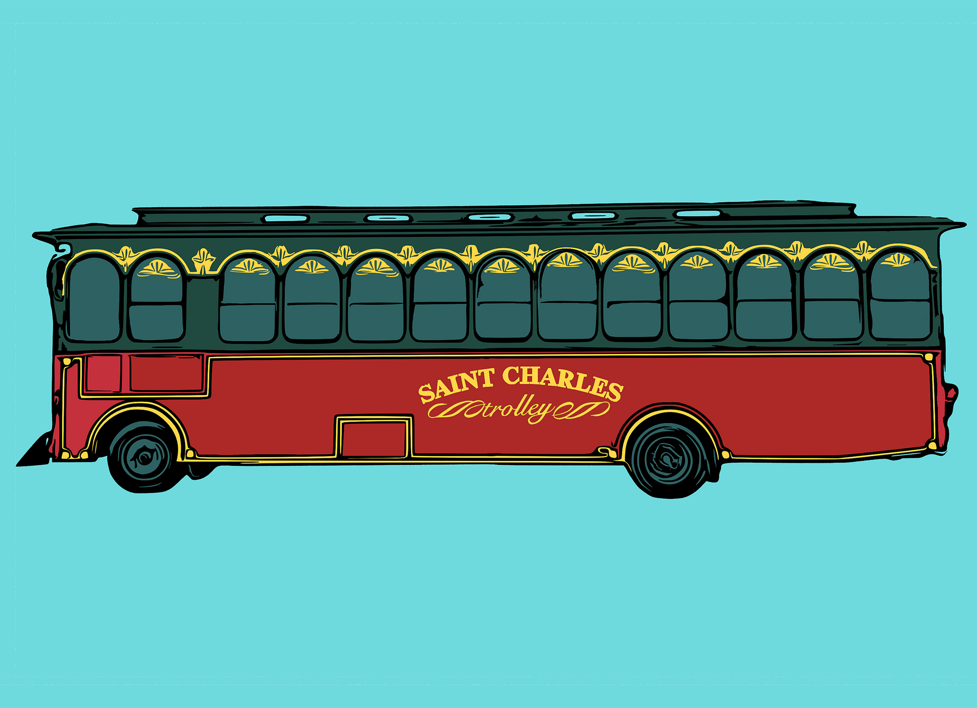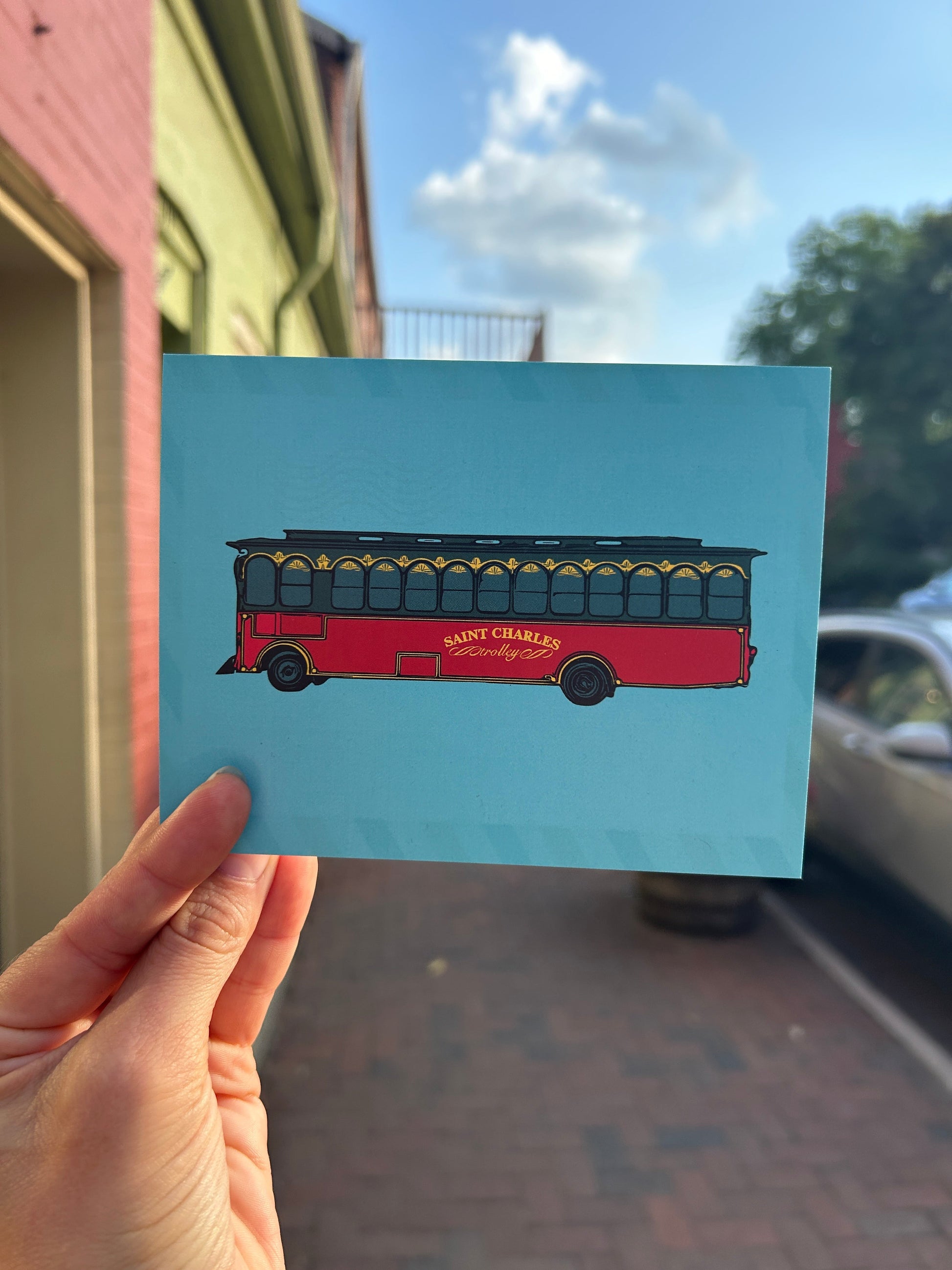 The attention to detail brings the trolley to life, showcasing its classic design against familiar St. Charles landmarks. This postcard is a must-have for anyone who loves St. Charles, perfect for sending a piece of our city's unique character to friends and family or as a keepsake for yourself.