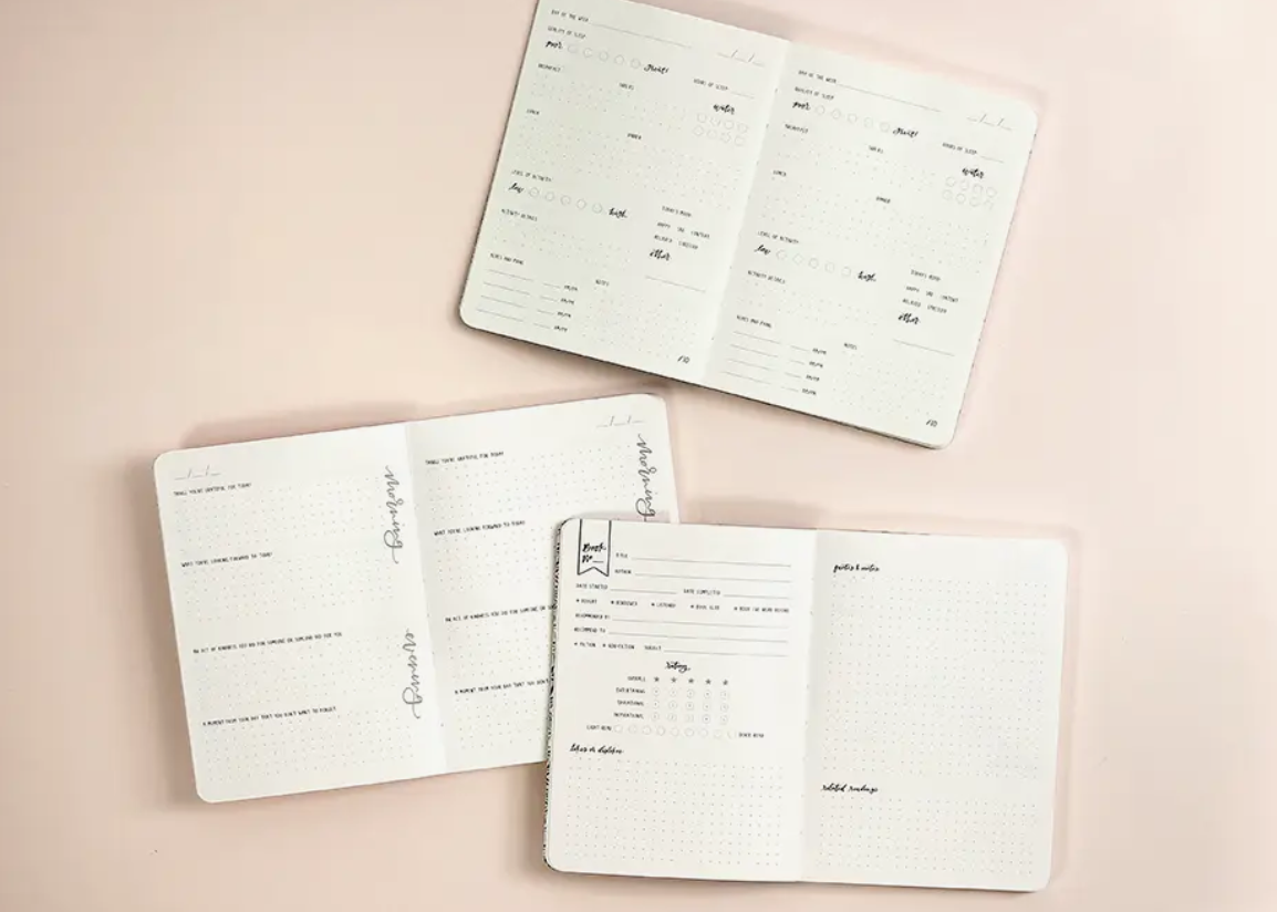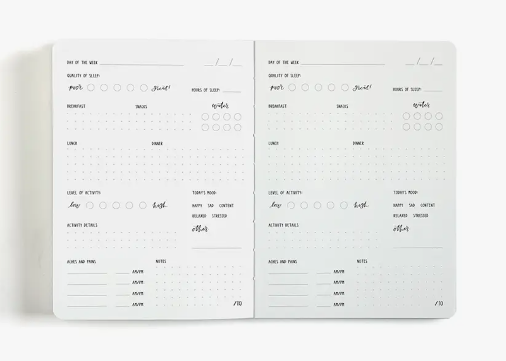 Track your overall health with entries for sleep, diet, exercise, and mood. Complete with prompts to help you review your progress, identify trends and set new goals.